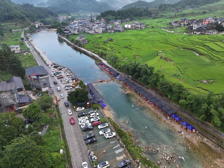 游客在廣西柳州市融水苗族自治縣香粉鄉(xiāng)雨卜村戲水消暑(7月19日攝,無人機照片)。新華社記者 黃孝邦 攝