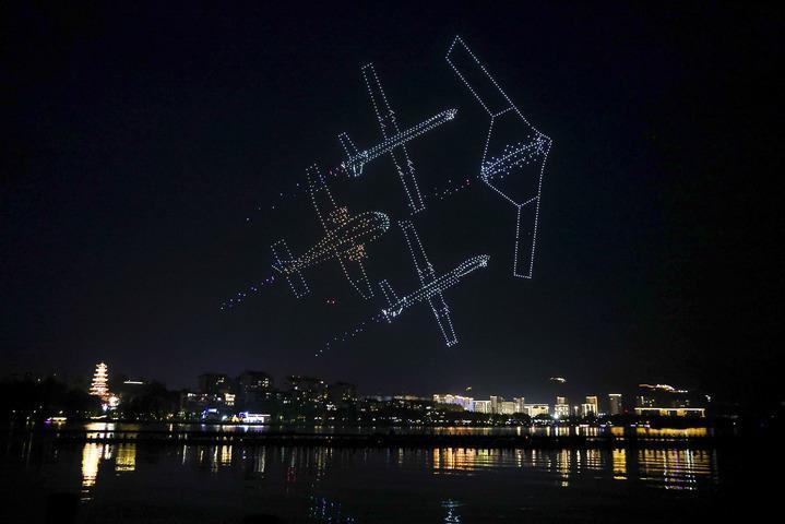 這是7月11日晚在重慶市梁平區(qū)雙桂湖國家濕地公園拍攝的無人機表演。新華社記者 黃偉 攝