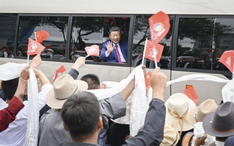 充滿節日氛圍的古城拉薩,從機場到住地主要街道兩旁彩旗舞動,各族群眾手持紅旗、捧著哈達,齊聲歡呼,表達歡迎和感激之情。習近平打開車窗,向沿途群眾頻頻揮手致意。