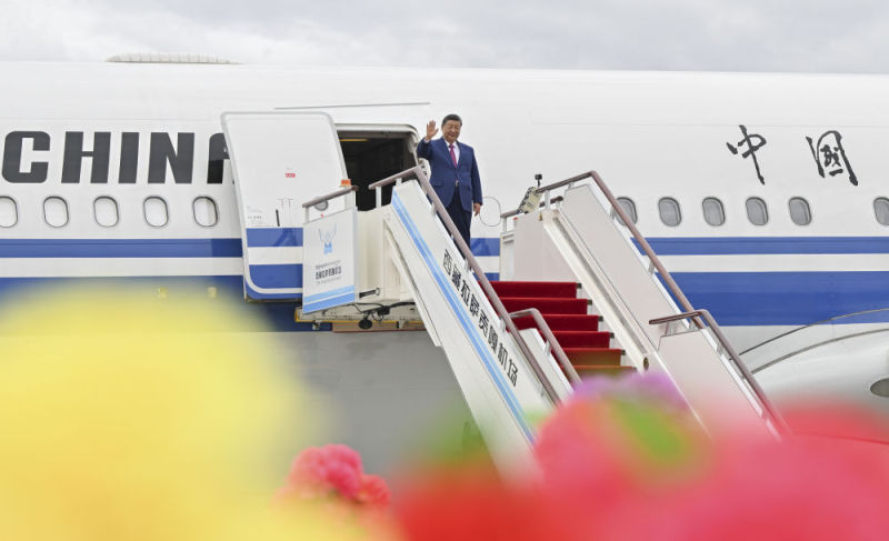 12時許,習近平乘坐的專機在貢嘎機場降落,等候在停機坪的西藏各族各界群眾熱烈歡呼。習近平走出艙門,向歡迎群眾揮手致意。