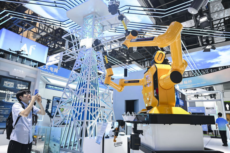 ??7月28日,在2025世界人工智能大會上,參觀者在中國南方電網展區拍攝“悟空”帶電作業機器人。新華社記者 陳浩明 攝