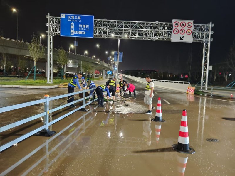 轄區漢霄一路、T5高架積水嚴重,執法人員第一時間對接機場動力公司、空港市政等部門,共同對積水進行清掃處理,迅速恢復道路暢通。