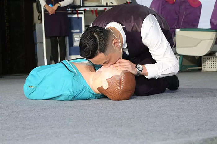 機上急救比賽項目中,各參賽組對抽取到的客艙險情進行現場包扎、CPR心肺復蘇等模擬救治。乘務員們憑借平時在工作中的豐富積累,運用高超專業技能,嫻熟準確的解決了各項模擬急救任務。老人、盲人、聾啞人,在客艙服務模擬項目中隊員們生動還原了可能遇到的機上突發事項,用優良的服務一一應對,充分展現出了中國空乘精湛的業務水平。