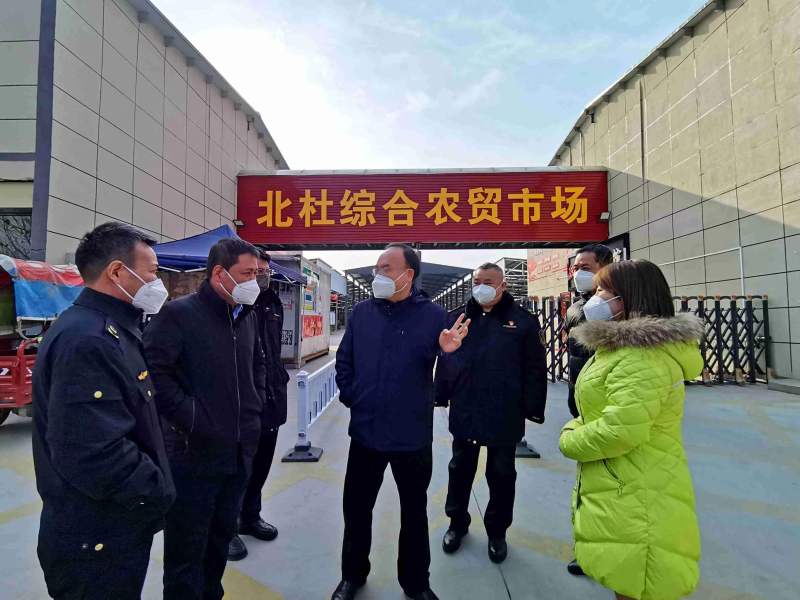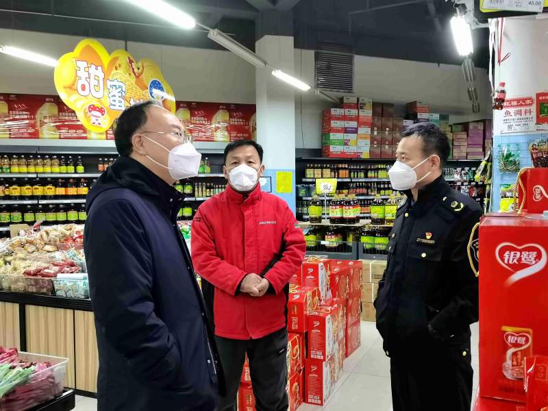 隨后,劉軍一行來到北杜綜合農貿市場和底張幸福里社區欣豐潤超市,聽取市場開辦方關于市場運行情況匯報,實地抽查商超、餐飲等門店的索證索票、進銷臺賬和經營狀況,詢問蔬菜、肉類、蛋奶、米面等民生物資供應和價格變化趨勢。他鼓勵商超、餐飲經營者和市場開辦方,要積極克服疫情帶來的不利影響,以節日群眾生活需求為導向,努力發揮市場供需調節作用,因地制宜組織貨源,凸顯優勢服務群眾,確保“雙節”市場供應充足、價格平穩、秩序良好。