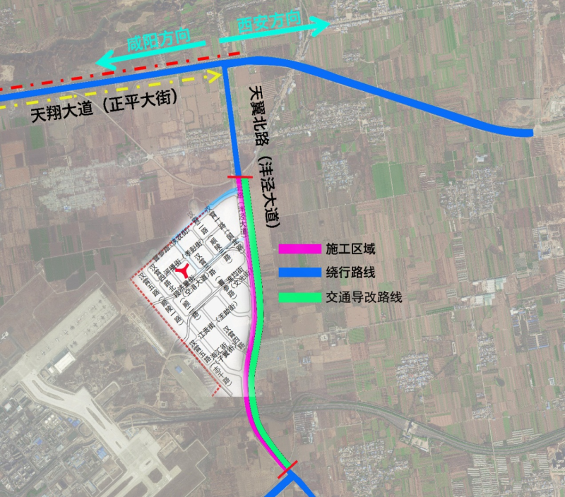 因西安咸陽國際機場三期擴建工程及西咸新區空港新城T5站前商務區市政基礎設施等重點項目建設,天翼北路工程車輛數量劇增,嚴重影響社會車輛及人民群眾出行安全。為最大限度降低重點項目施工給市民通行帶來的不便,確保社會車輛和群眾通行安全,經現場踏勘調研并充分論證,決定現對天翼北路實施全封閉施工,公告如下: