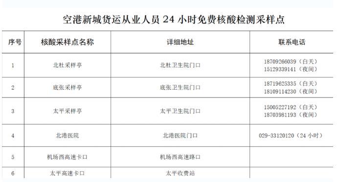 根據西安市相關防疫政策,貨運物流從業人員必須每24小時進行一次核酸檢測,為方便廣大從業人員,空港新城在區內設置6處免費核酸檢測點位,貨運從業人員可每日憑借從業資格證免費進行一次核酸檢測,時間為2022年4月14日至2022年4月17日。具體點位信息詳見下表。