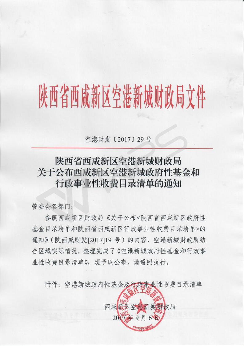 關于公布西咸新區空港新城政府性基金和行政事業性收費目錄清單的通知